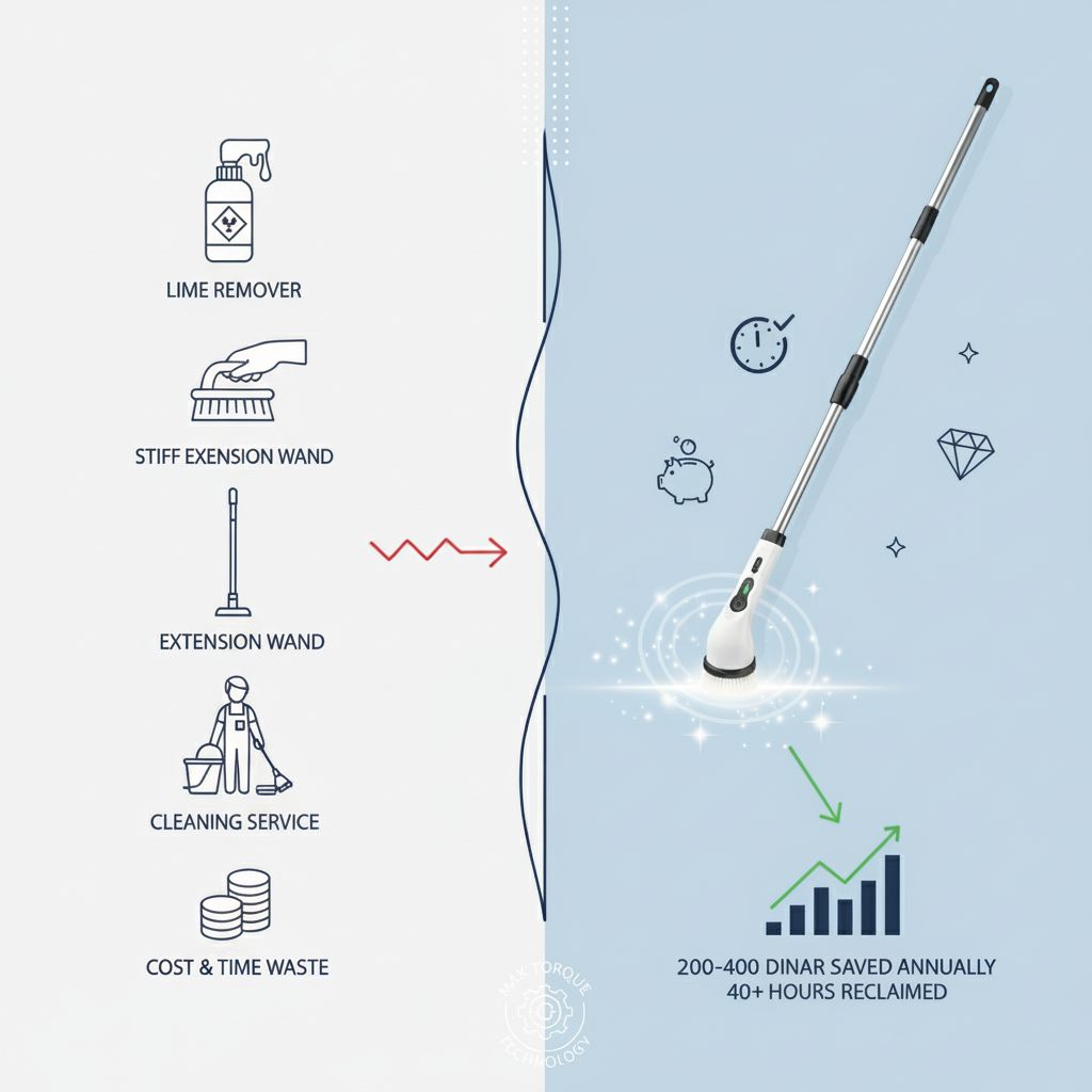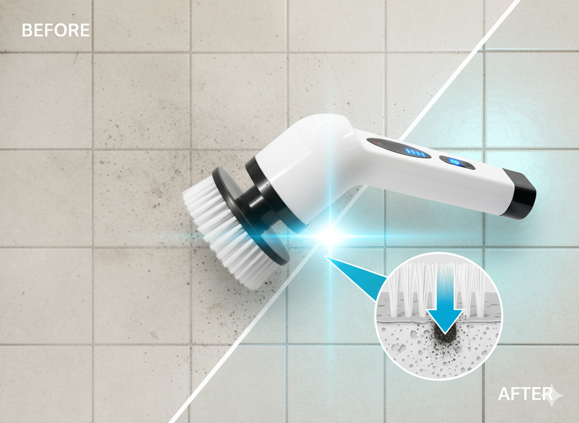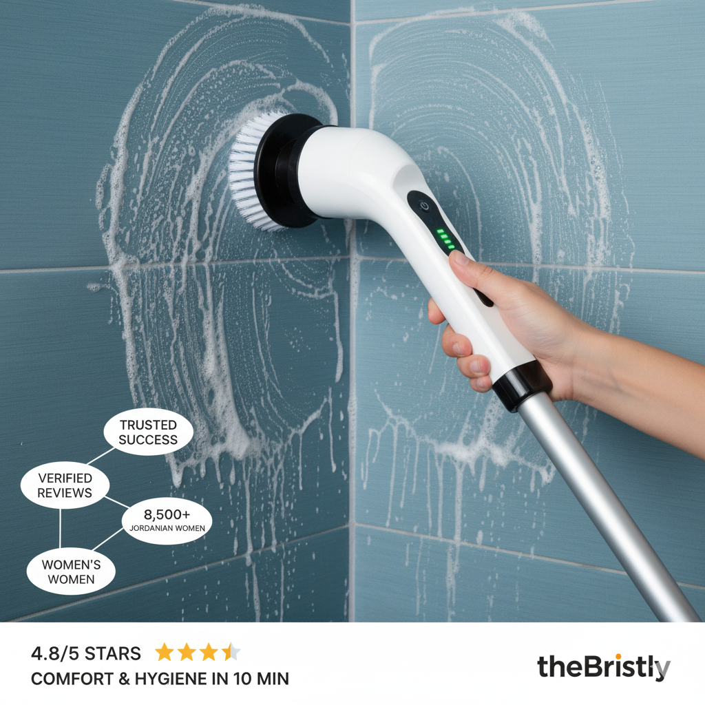 الفرشاة اليدوية تجبركِ على الانحناء والركوع وتسبب آلام ظهر تستمر أياماً. بريستلي بعموده الطويل (115 سم) يتيح لكِ التنظيف وأنتِ واقفة — بدون انحناء، بدون ألم.