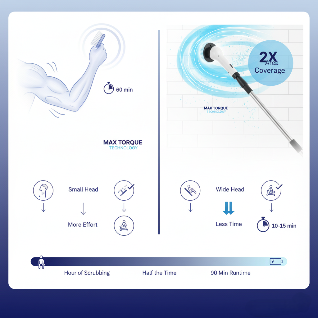 الآن تُنجزين نفس العمل في 10-15 دقيقة فقط بفضل رأس الفرشاة الواسع (20 سم) الذي يغطي مساحة ضعف الرؤوس الصغيرة القياسية.