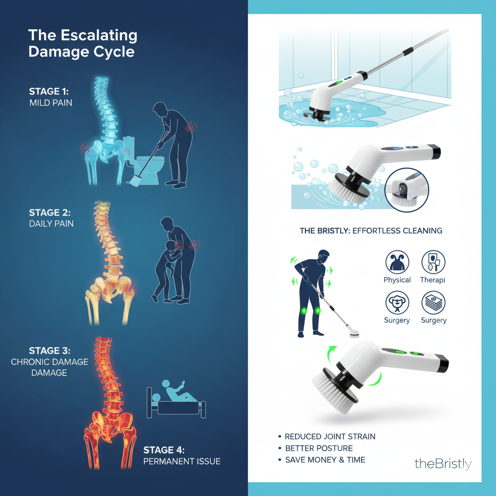 المرحلة 1 (الشهر 1-2): ألم خفيف بعد تنظيف الحمام يختفي خلال ساعات. إزعاج متقطع في أسفل الظهر عند الانحناء. تأثير محدود — لا يزال بإمكانكِ إكمال المهام