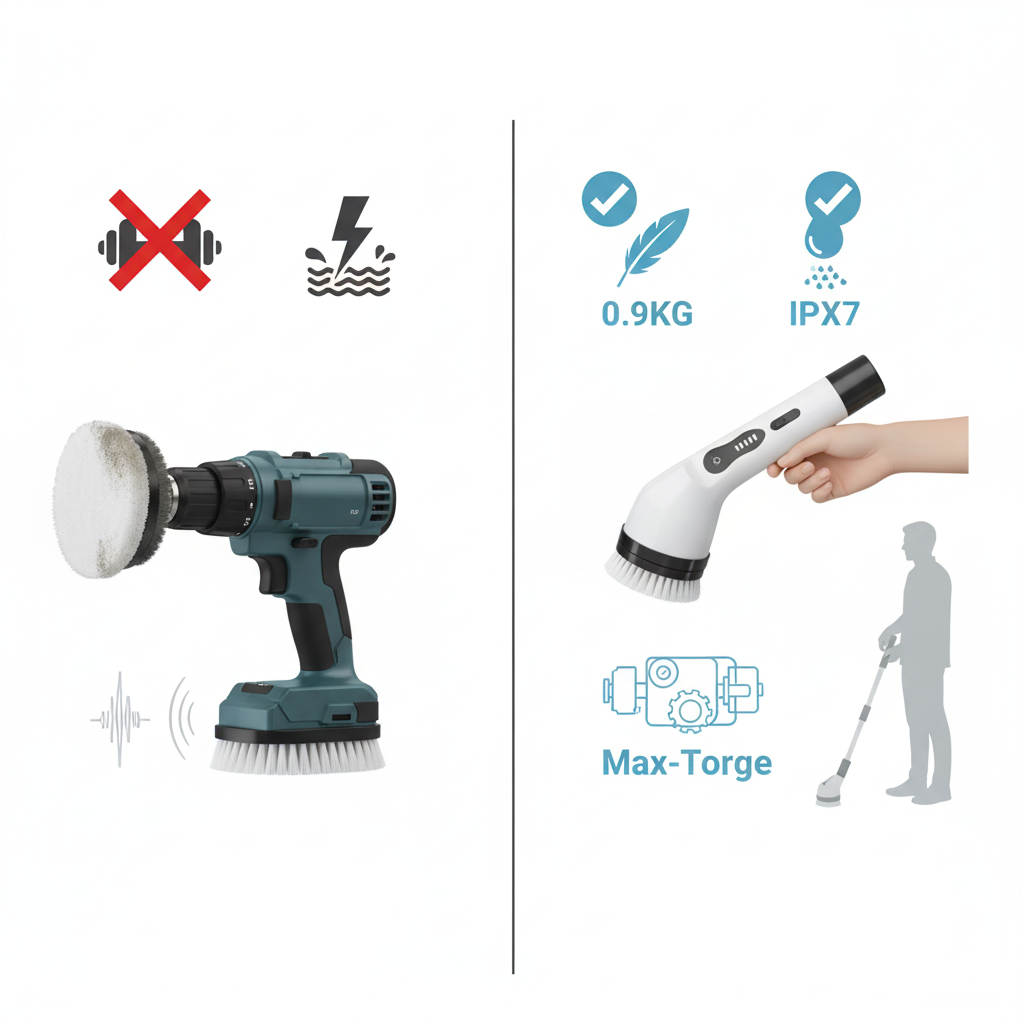 لكن المثقاب يزن 2-3 كيلو، غير مقاوم للماء، وخطر في الحمام الرطب — ووصلته القصيرة (10 سم) تجبركِ على الانحناء.